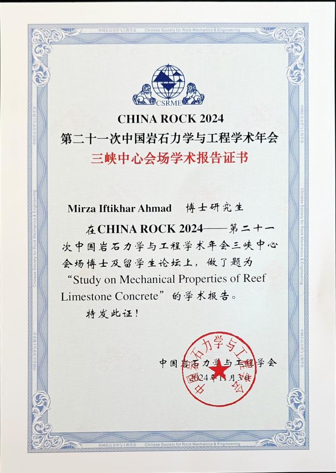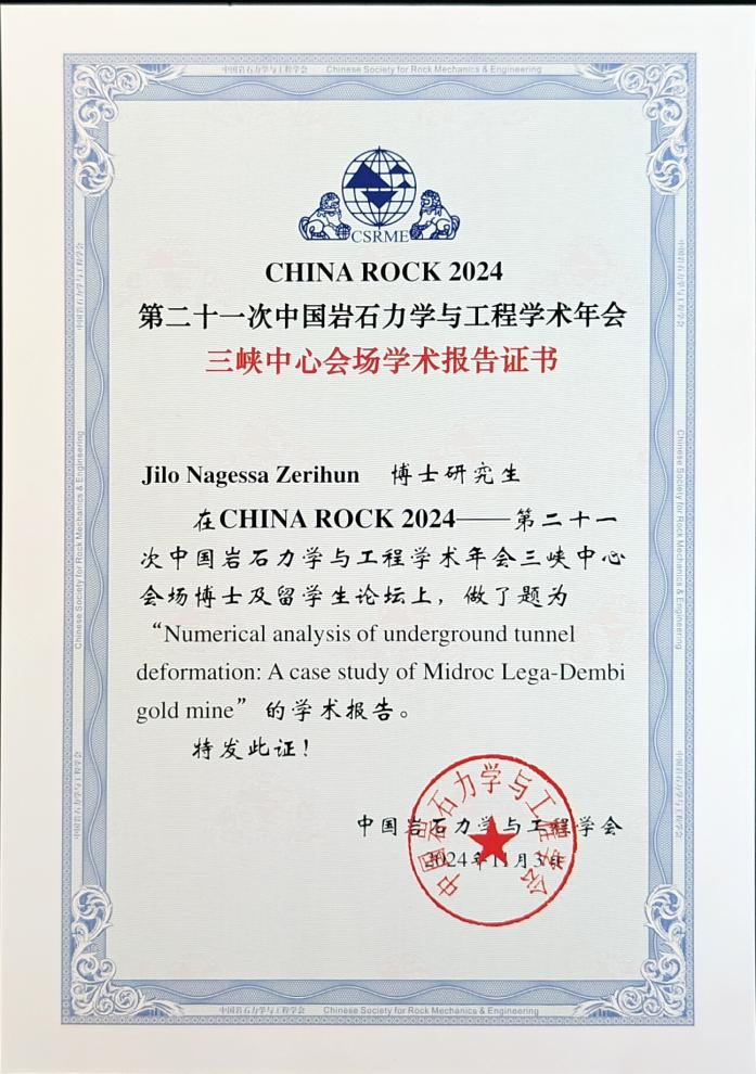 我院罗忆研究员指导的两名留学博士研究生Mirza Iftikhar Ahmad和Jilo Nagessa Zerihun积极参与了“博士及留学生论坛”,并分别作了题为“Study on mechanical properties of reef limestone concrete”和“Numerical analysis of underground tunnel deformation: A case study of Midroc Lega-Dembi gold mine”的学术分享交流,展示了国际视野下的研究成果,进一步促进了跨文化学术交流和研究合作,提升了我院在岩石力学领域的学术影响力。