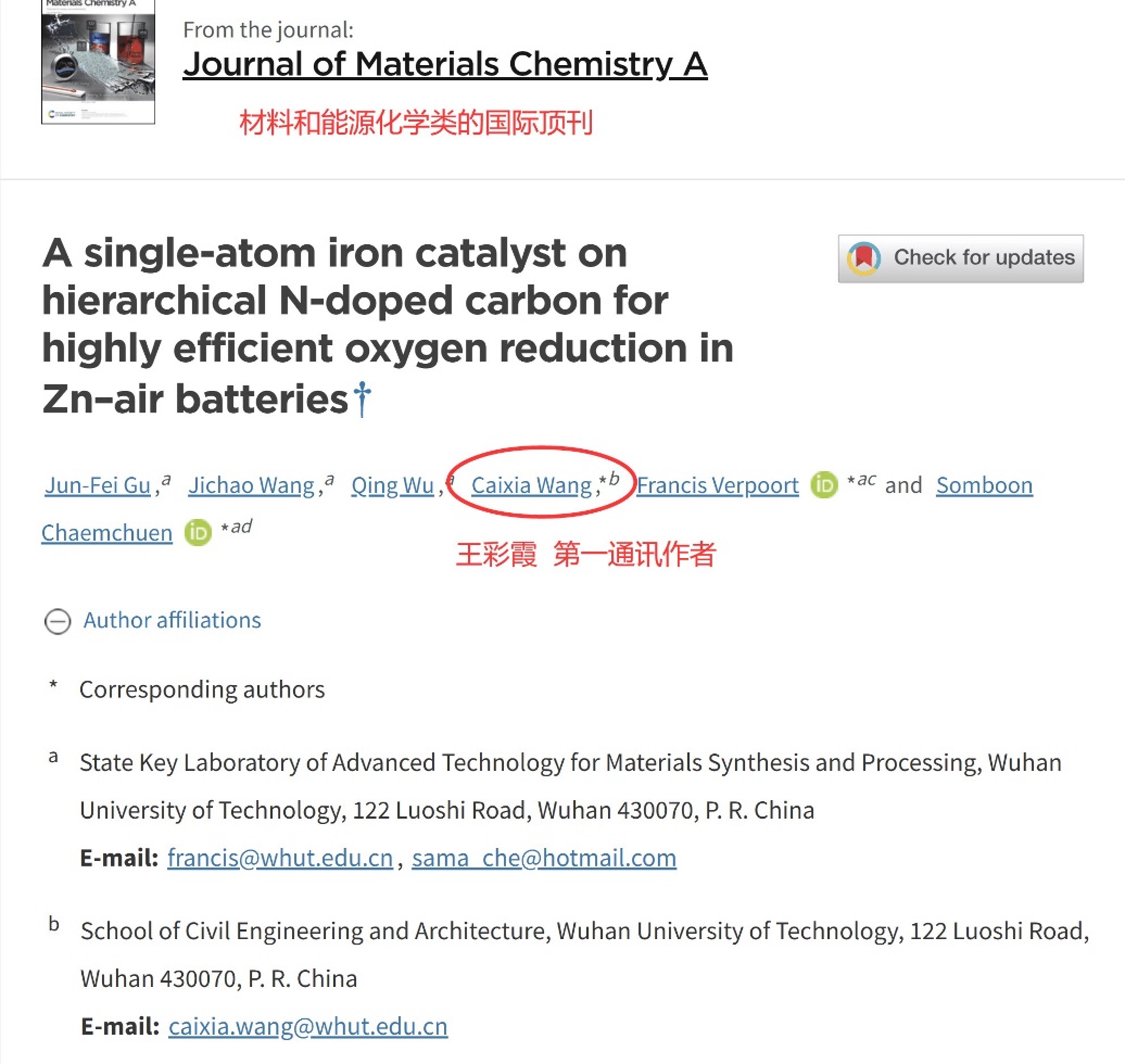 《Journal of Materials Chemistry A》是英国皇家化学会(Royal Society of Chemistry,简称RSC)下的一本旗舰期刊,是材料化学领域的权威期刊,专注于报道材料在能源和可持续性方面应用,以其严格的审稿标准和高质量的学术要求而闻名,影响因子为10.7。王彩霞老师的论文能够在此期刊上发表,不仅是对其研究成果的肯定,也是对武汉理工大学科研水平的国际认可。