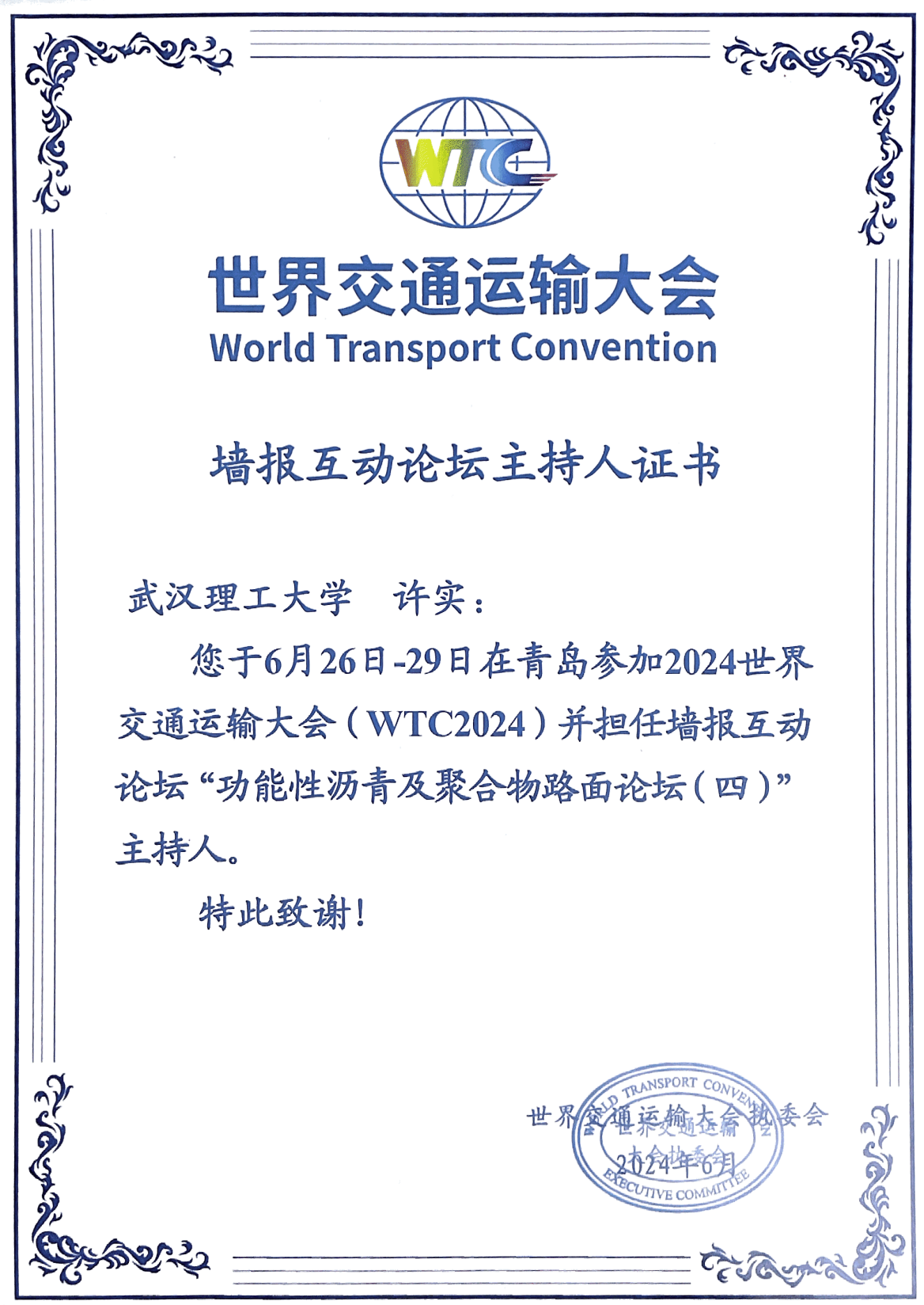 我院道桥系青年教师许实于26日至29日在青岛参加2024世界交通运输大会,并作为公路学部青年委员担任墙报互动论坛“功能性沥青及聚合物路面论坛(四)”主持人,并获得大会执委会的特别致谢,图为大会颁发的分论坛主持人证书以及许实在现场为报告嘉宾颁发报告证书的照片。