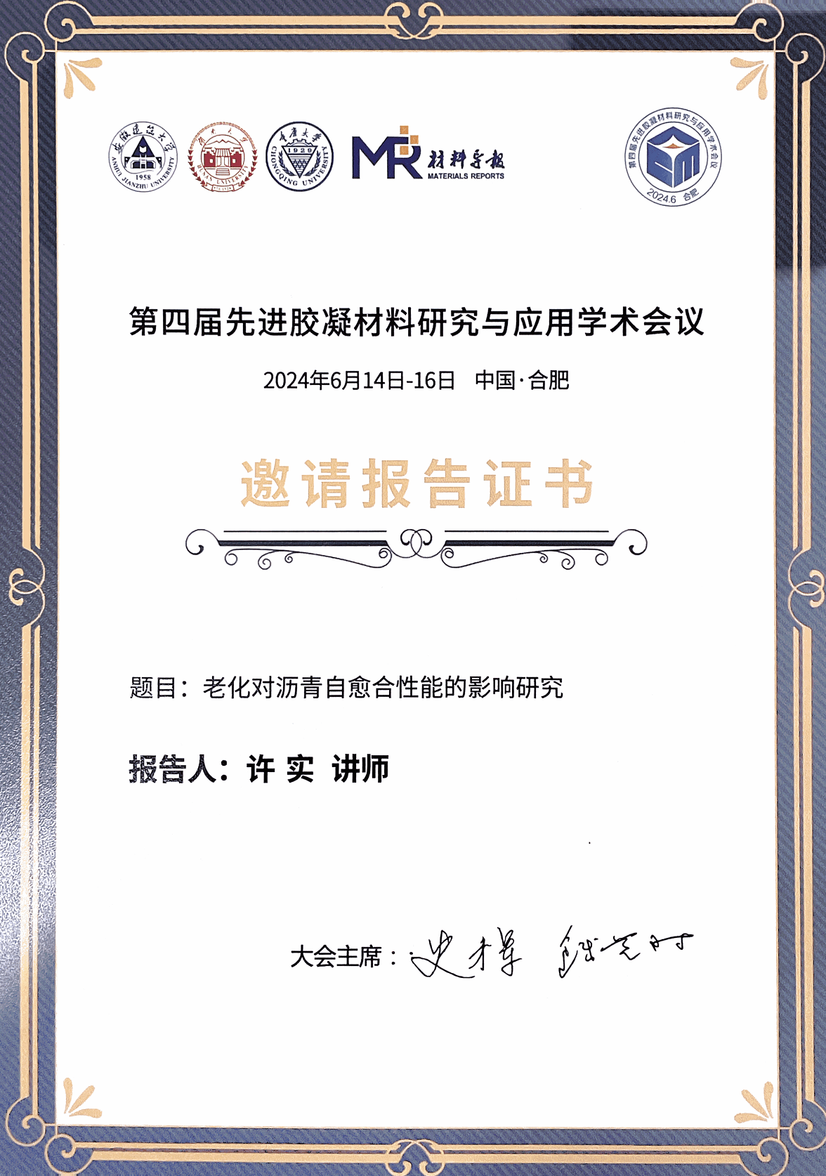 我院道桥系青年教师许实以《老化对沥青自愈合性能的影响研究》为题参加了本次大会并作邀请报告。许实博士的报告阐述了课题组在沥青自愈合性能领域的研究进展,尤其是不同老化程度、不同改性剂对沥青物理性能、流变性能、化学组成、自愈合性能的影响研究,该报告提出了沥青材料自愈合性能的综合评价与预测方法,对于提升沥青自愈合性能与沥青路面使用寿命有重要的意义,在会议上得到了专家学者的高度关注和认可。