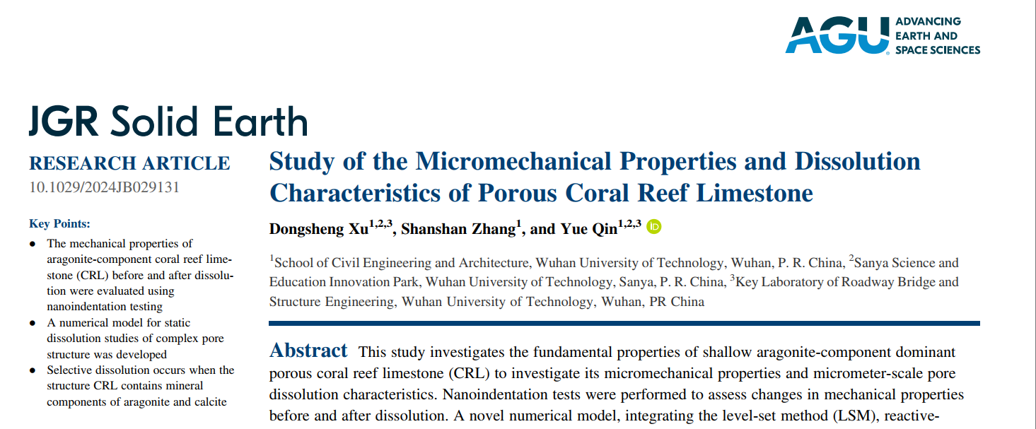 3522vip浦京集团官网基础设施智能感知与安全防护研究团队,依托国家优秀青年基金和面上基金等项目,在Journal of Geophysical Research: Solid Earth(《地球物理研究杂志:固体地球》)上发表题为Study of the Micromechanical Properties and Dissolution Characteristics of Porous Coral Reef Limestone的研究成果,该研究揭示了珊瑚礁灰岩溶蚀作用下孔隙结构演化机理,量化表征了溶蚀前后力学性能变化行为。武汉理工大学土木工程建筑学院为该成果的第一完成单位,徐东升教授,博士生章珊珊和秦月教授共同科研攻关,实现了工程地质学、化学、岩土试验力学等学科的交叉融合。