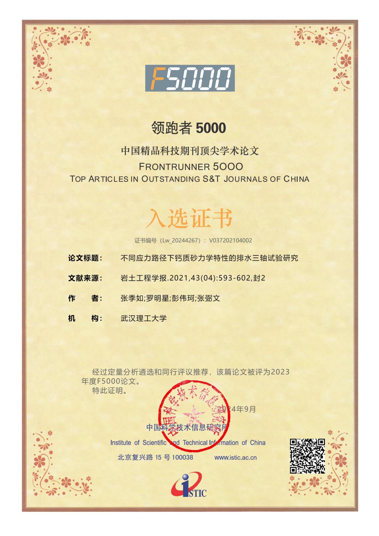近日,国家科技部中国科学技术信息研究所(中信所)发布了2024年“领跑者5000—中国精品科技期刊顶尖学术论文(F5000)”的入选论文名单,我院张季如教授课题组发表在《岩土工程学报》2021年第43卷4期上的论文《不同应力路径下钙质砂力学特性的排水三轴试验研究》入选2023年度F5000,论文第一作者和通讯作者为张季如教授。该文对钙质砂开展了不同应力路径下的高压三轴试验,揭示了应力路径对钙质砂变形、强度和颗粒破碎的影响规律,并探明其在不同应力路径试验中的差异除了源于砂土应力路径依附性的特性外,还来自于颗粒破碎程度不同产生的影响。
