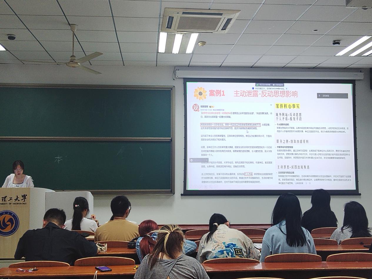 随后,黄紫怡同志播放了2025年保密公益宣传片《指尖的守护》,从理论、案例、实践三个维度展开讲解。她结合近年高校保密警示案例,剖析了学生群体中易发的信息泄露风险点,如学术数据管理、网络社交平台使用等,并通过播放保密教育视频,直观展现了泄密行为的严重后果。