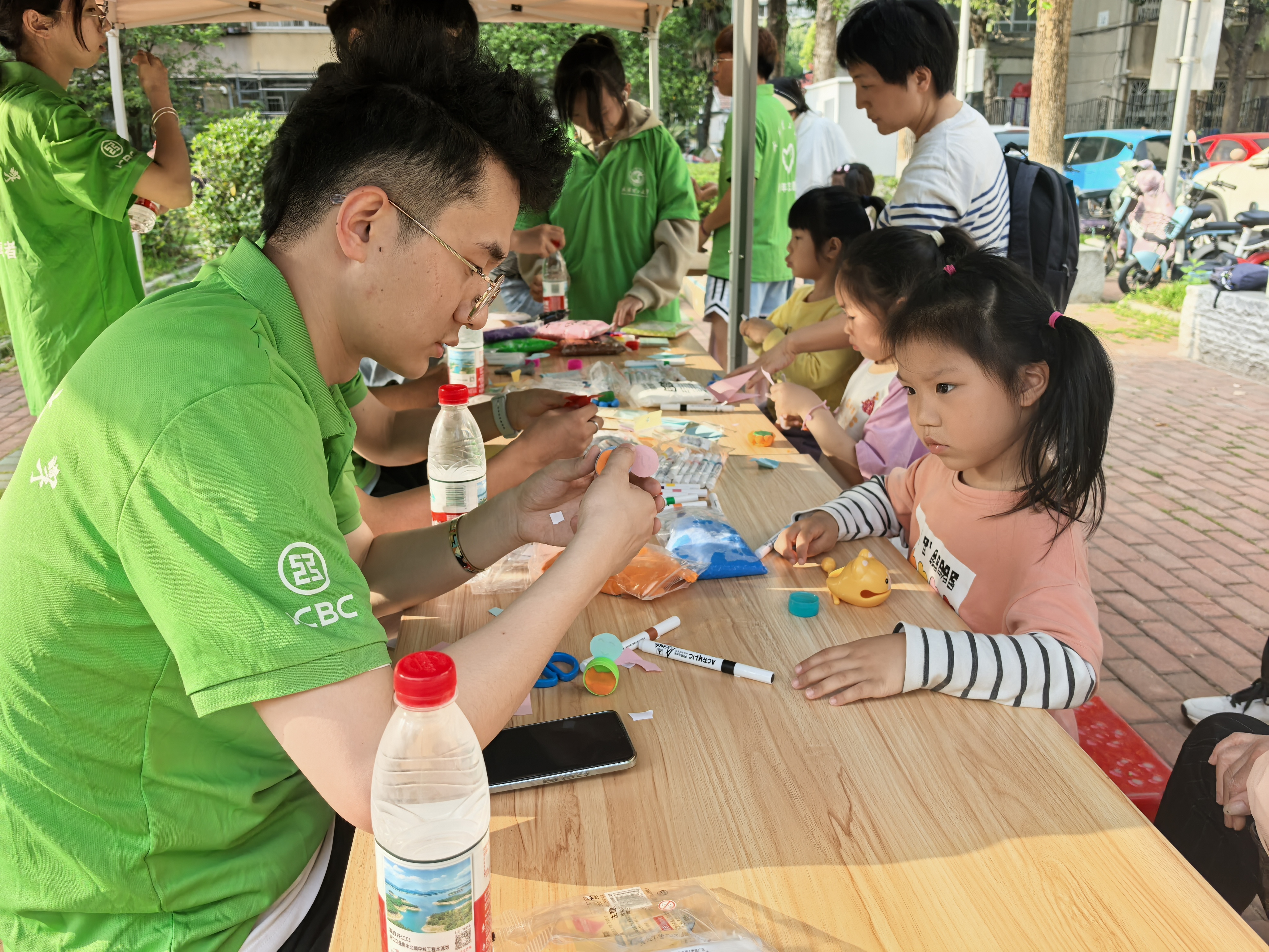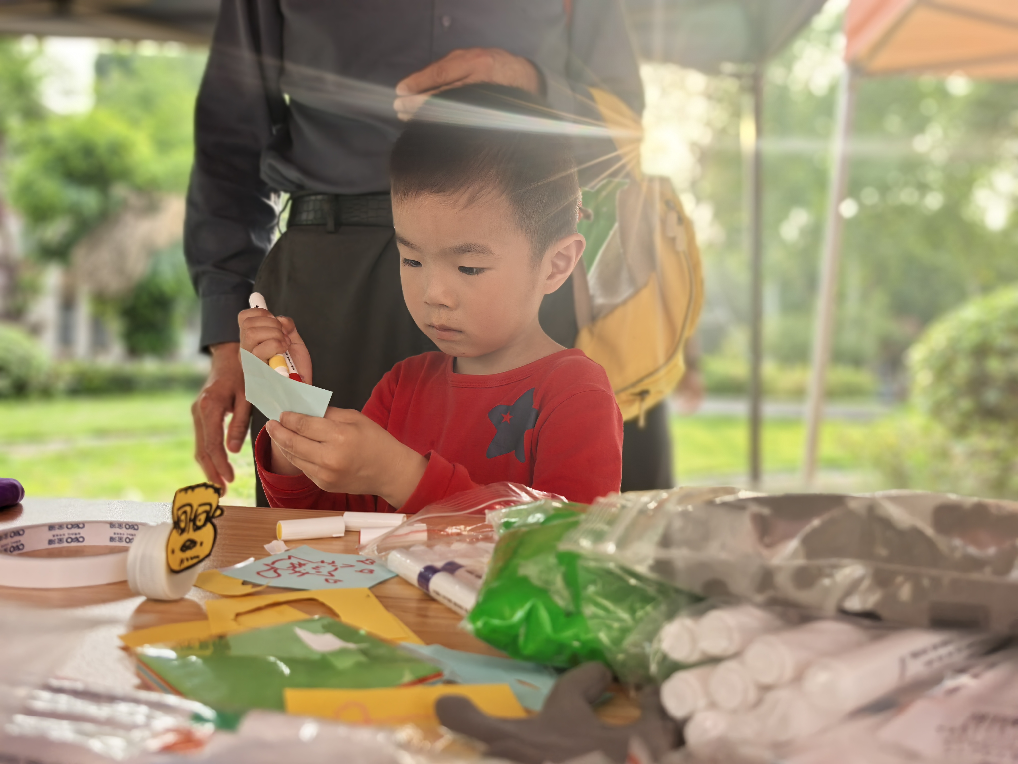 当日午后,志愿者团队提前抵达活动现场,精心布置色彩斑斓的手工操作台,整齐摆放瓶盖、彩色黏土、卡通贴纸等材料。16时许,随着幼儿园放学,孩子们带着欢声笑语逐渐汇聚到活动场地。志愿者们以亲切笑容迎接小朋友,耐心邀请他们参与活动,同时向家长细致讲解活动的美育目标、安全保障及亲子互动形式,贴心的沟通迅速拉近了与家长和儿童的距离。
