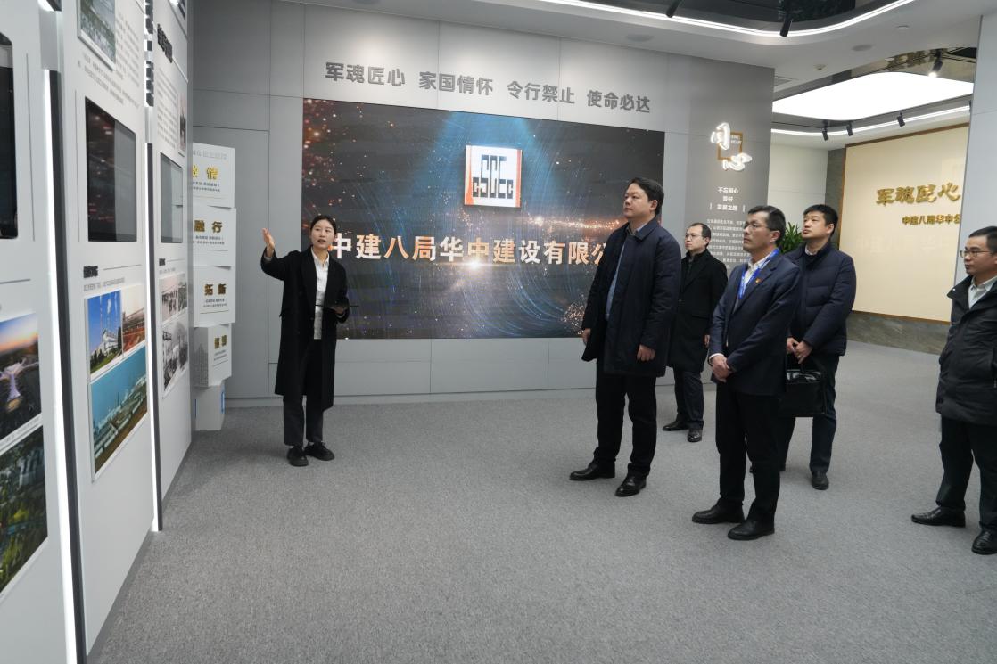 会议开始前,中建八局华中建设有限公司党委书记、董事长徐玉飞带领学院一行参观了公司企业文化展厅,详细介绍了公司发展历程、标志性成果、企业文化等内容。